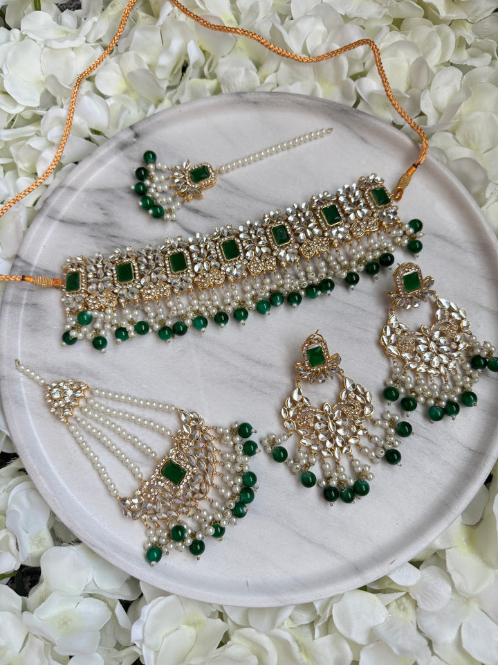 A graceful blend of elegance and tradition, this semi-bridal jewelry set is designed to give you the perfect bridal glow without the heaviness of a full bridal ensemble. The set includes a statement necklace, matching earrings, a delicate center tikka, and an elegant side jhumar, completing the semi-bridal look with timeless charm.