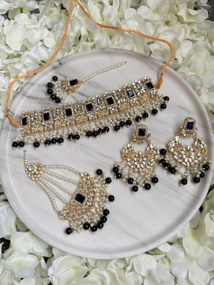 Beautifully crafted with Kundan/Polki detailing, accented with pearls and zircons, this set brings sophistication and sparkle to your bridal style. Ideal for mehndi, nikkah, engagement, or walima, it complements both traditional and modern outfits effortlessly.