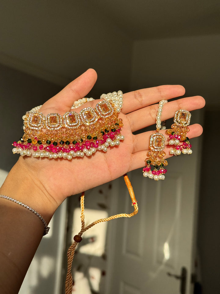 A versatile jewellery set that adds instant charm to any outfit! This set includes a stylish choker necklace, matching earrings, and a classic center tikka, making it perfect for weddings, parties, and festive occasions.