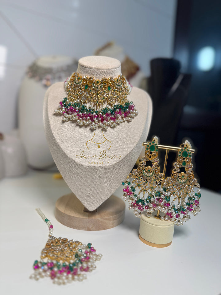 Elevate your traditional look with this beautifully crafted Pakistani-style choker set. The bold, intricately designed choker is paired with matching earrings featuring single saharas and a delicate tikka, completing the set with timeless elegance.