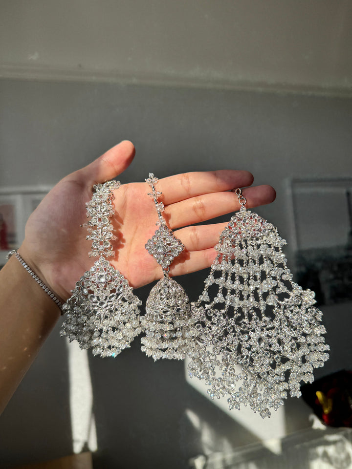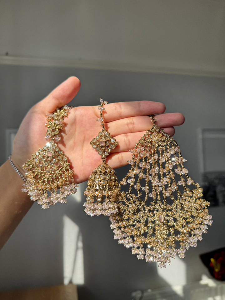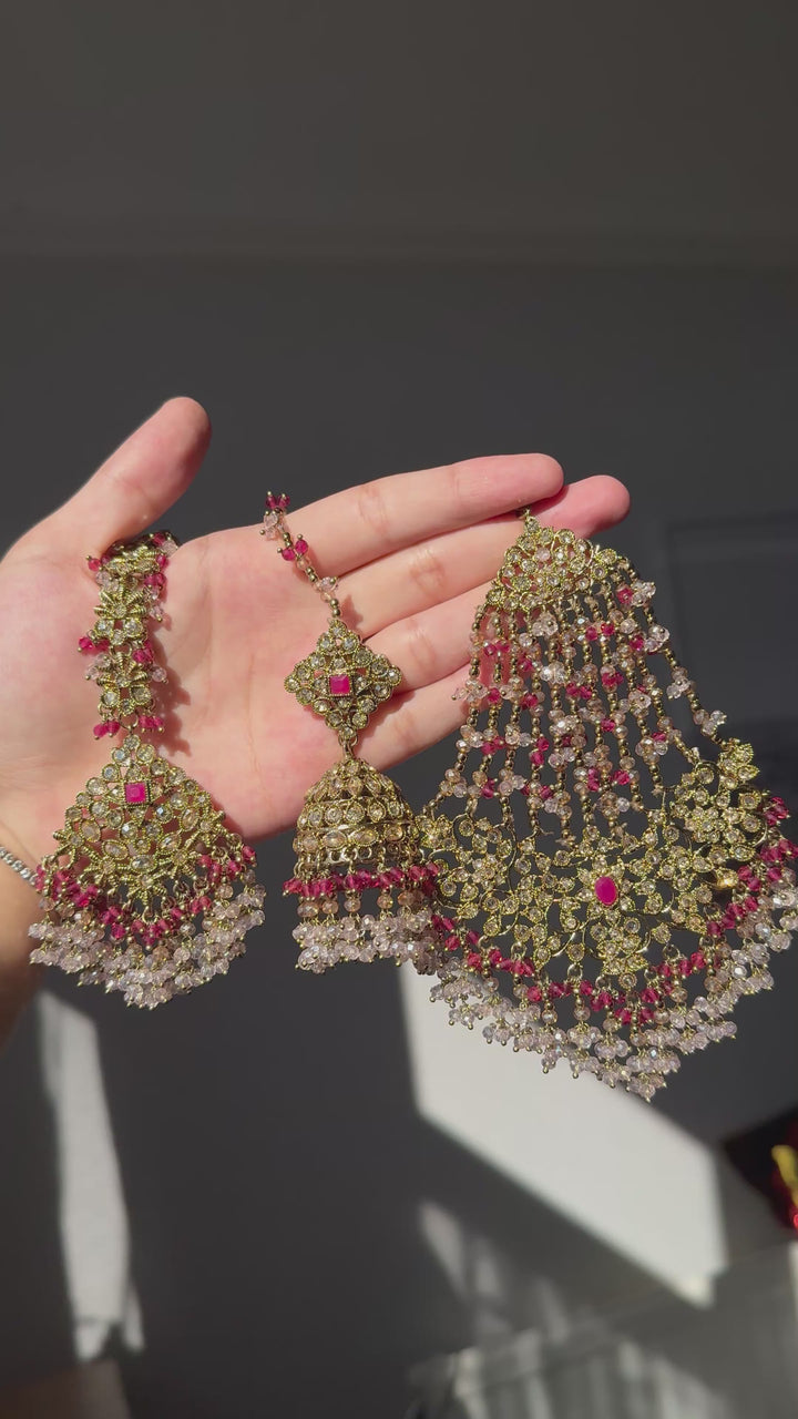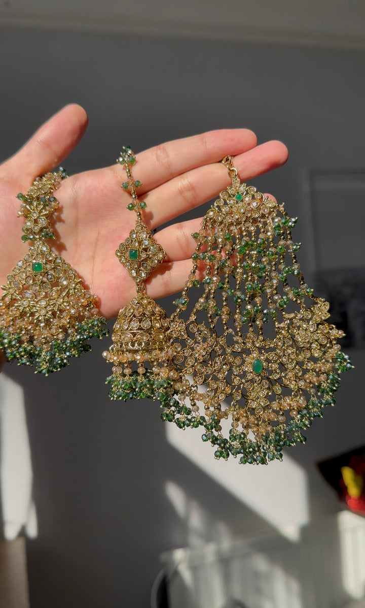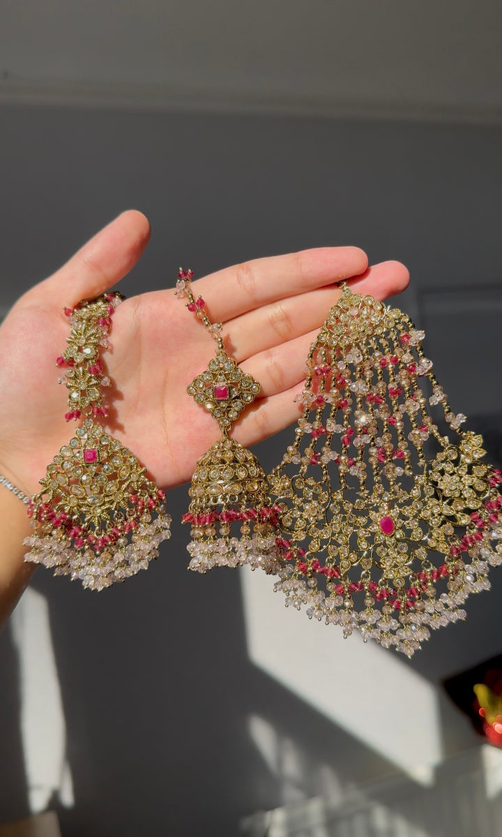 - Tikka (forehead pendant): Designed to match the jhumar, the tikka features similar detailing with a central pendant and pearl drops, adding balance and symmetry to the overall head jewelry.