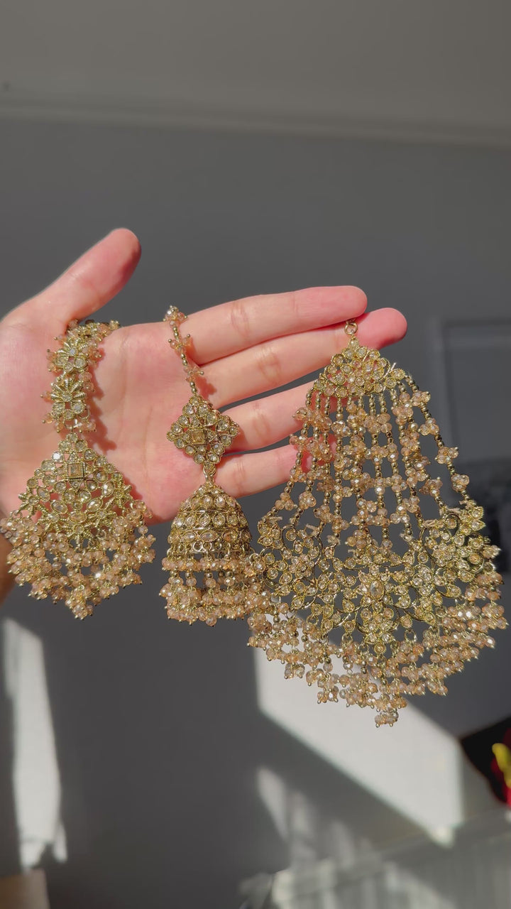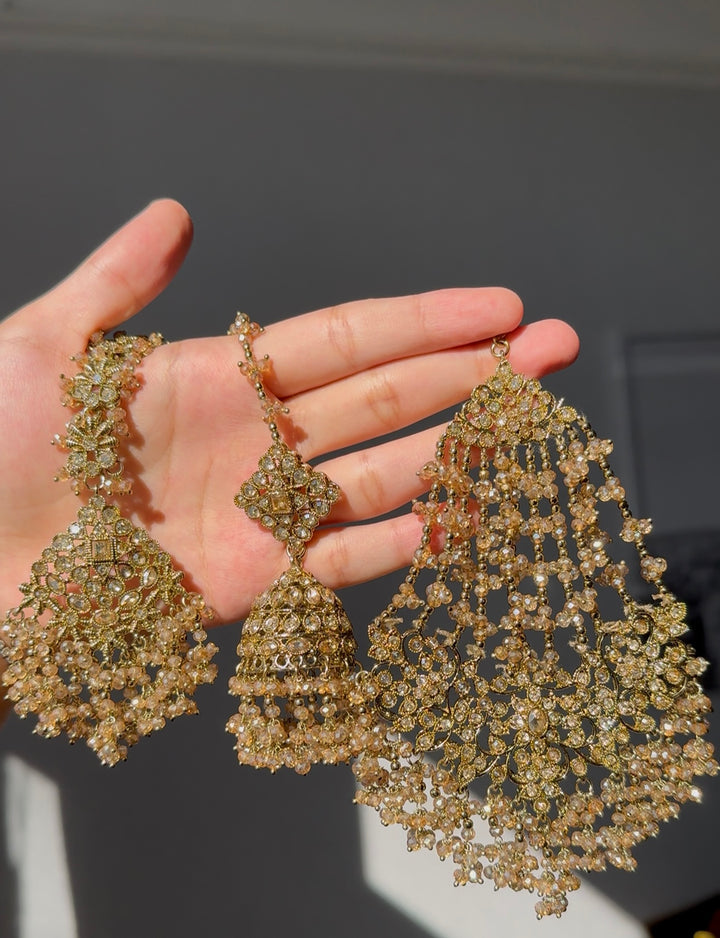 - Jhumar (passa): A beautifully crafted side headpiece featuring intricate gold-toned metalwork, embedded with shimmering white stones and delicate pearls. The design cascades elegantly, creating a graceful look on the side of the forehead.
